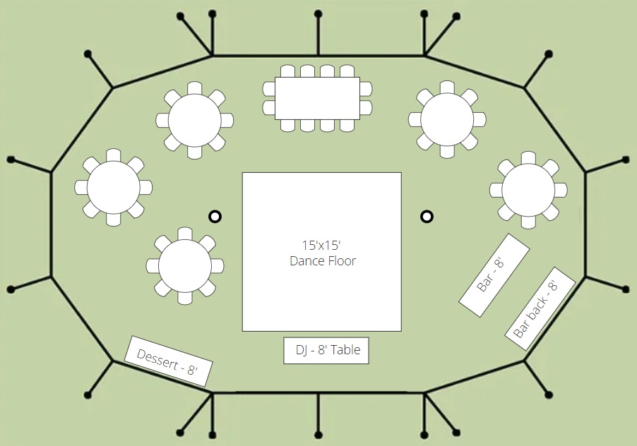 The 32' x 51' tent has a compact footprint but offers ample space to accommodate 50-75 seated guests, making it a popular choice for smaller events. It is ideal for outdoor ceremonies, bridal and baby showers, funeral receptions, cocktail parties, and private gatherings. Additionally, this tent can be used as a separate cocktail/bar area or a generously sized catering tent alongside larger reception tents.