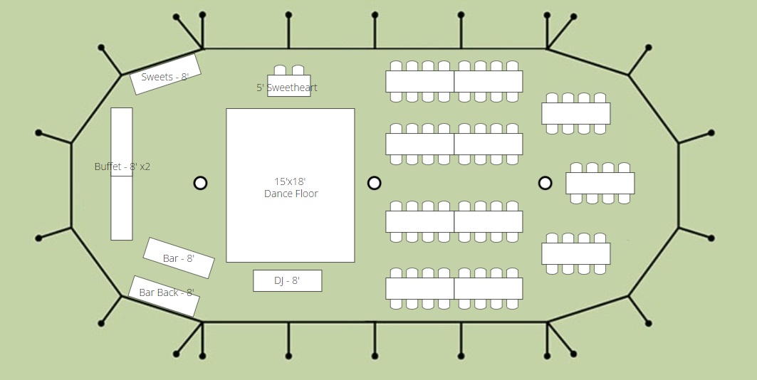 With three center poles adorned with nautically inspired pennant flags, this sailcloth tent offers remarkable versatility. It comfortably accommodates a sit-down meal for 75-100 guests and includes space for a dance floor.