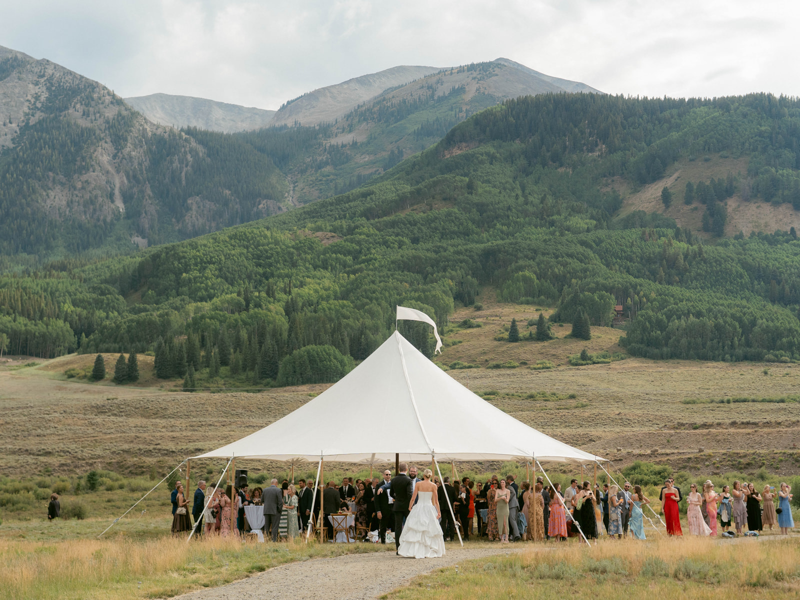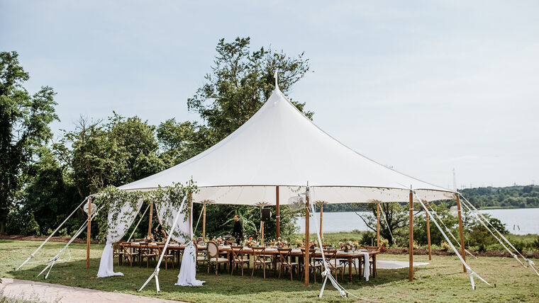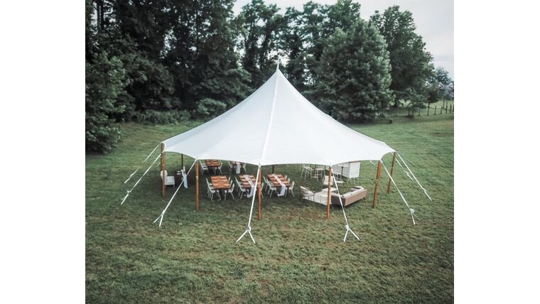 The 45’ Round is our largest round tent, featuring sweeping panels of sailcloth radiating from a single center pole. This versatile and fun tent is perfect for a variety of events, including rehearsal dinners, baby showers, bridal showers, community gatherings, sporting event registrations, and festival activities. It can accommodate smaller weddings with fewer than 100 guests or serve as a separate space for cocktail hour.