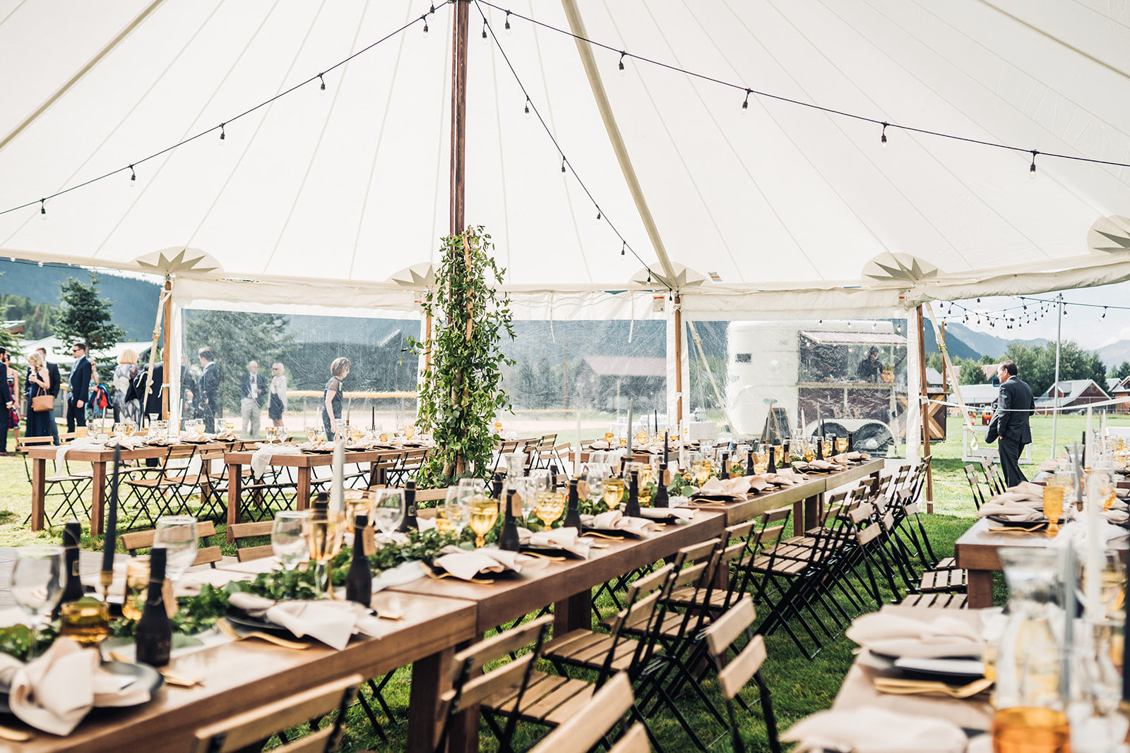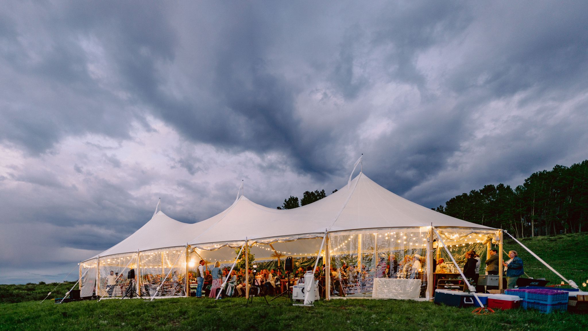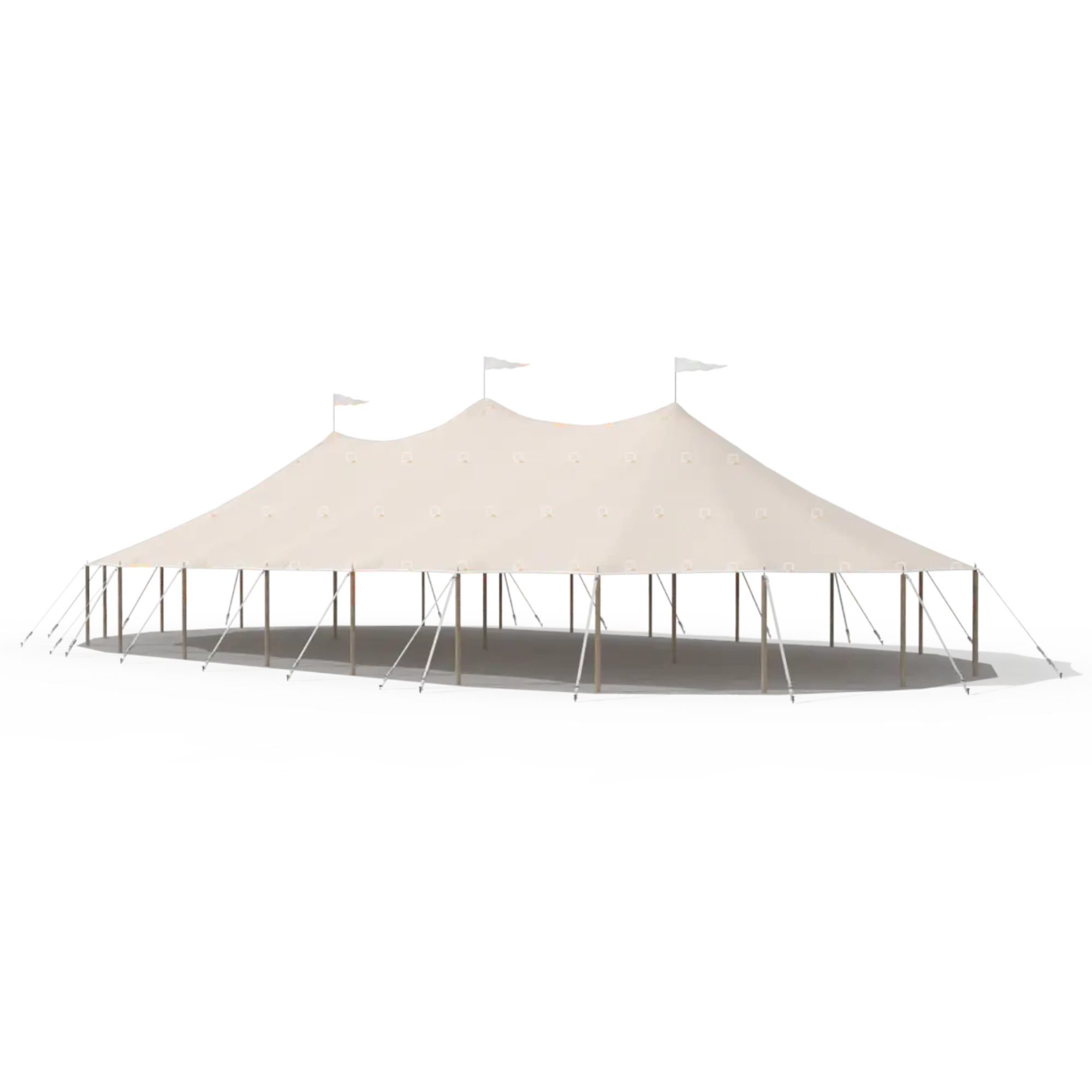 This is our most popular tent and our top recommendation for weddings with 150+ guests. Featuring three peaks supported by three hand-milled center poles, it fits seamlessly into various landscapes. Paired with a 20’ x 20’ catering tent, it’s the perfect choice for an outdoor wedding reception. It's also a favorite for festivals, band concerts, and academic events. For shoulder seasons, don’t forget to include tent heaters—we recommend using them up until mid-June and starting again in mid-September.