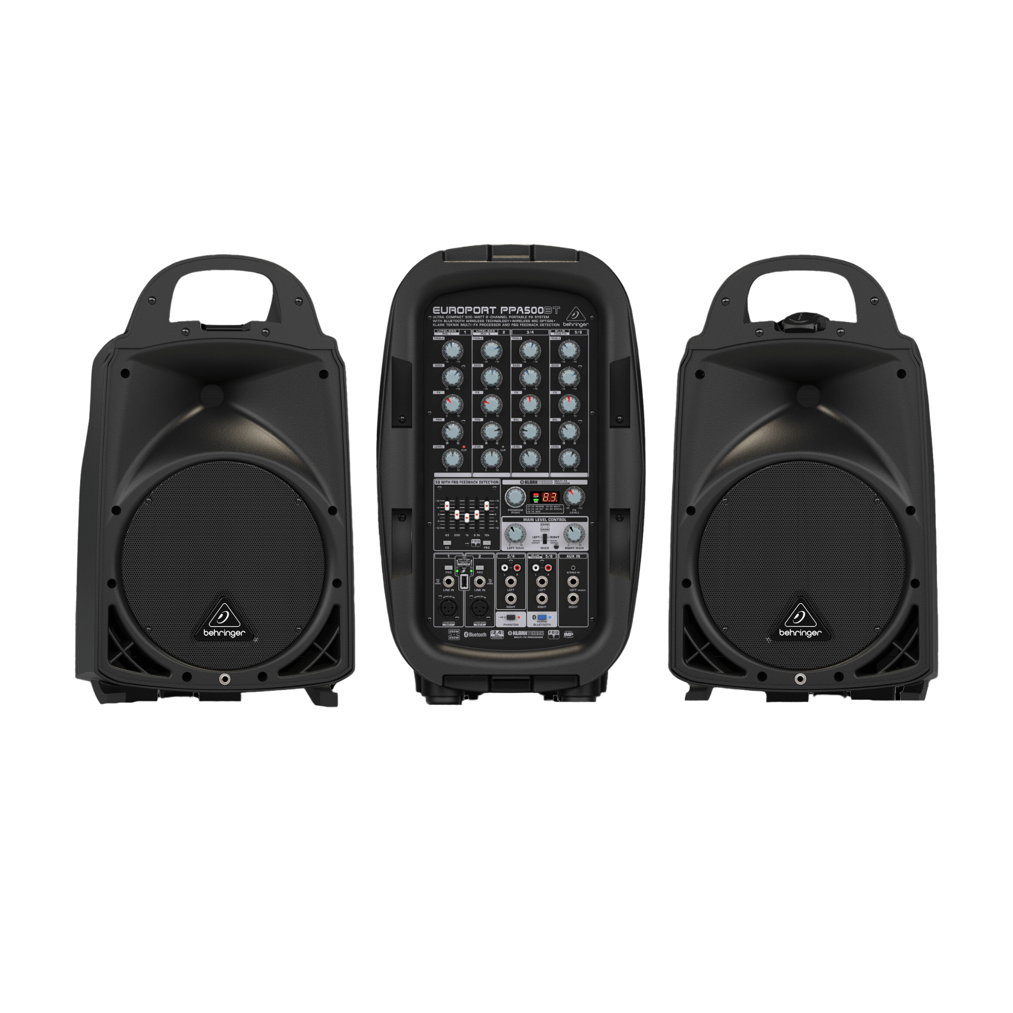 Description: This is a convenient, portable all-in-one PA system. There are inputs for two microphones, two additional instruments, and built-in Bluetooth wireless connectivity for music streaming. Adding wireless microphones is also an option. 500 watts. This sound system does need to be plugged into power