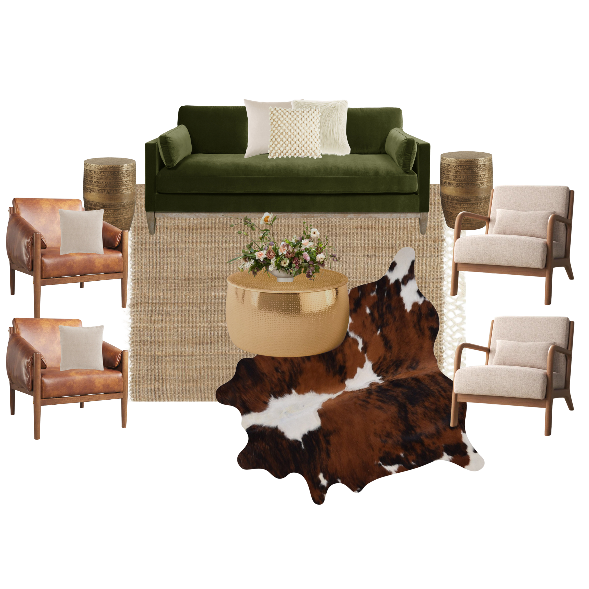 Description: Elevate your event with the 'Teocalli Lounge' package. Featuring a lush emerald green velvet sofa, warm leather armchairs, and chic wood-accented fabric chairs, this setup exudes timeless elegance with a modern twist. A natural jute rug layered with a statement cowhide adds texture, while the hammered gold coffee table and matching metallic accents bring a touch of luxury. Perfect for mountain-inspired weddings or outdoor gatherings, the Teocalli Lounge combines rugged charm with refined sophistication, offering your guests a cozy and stylish space to mingle.