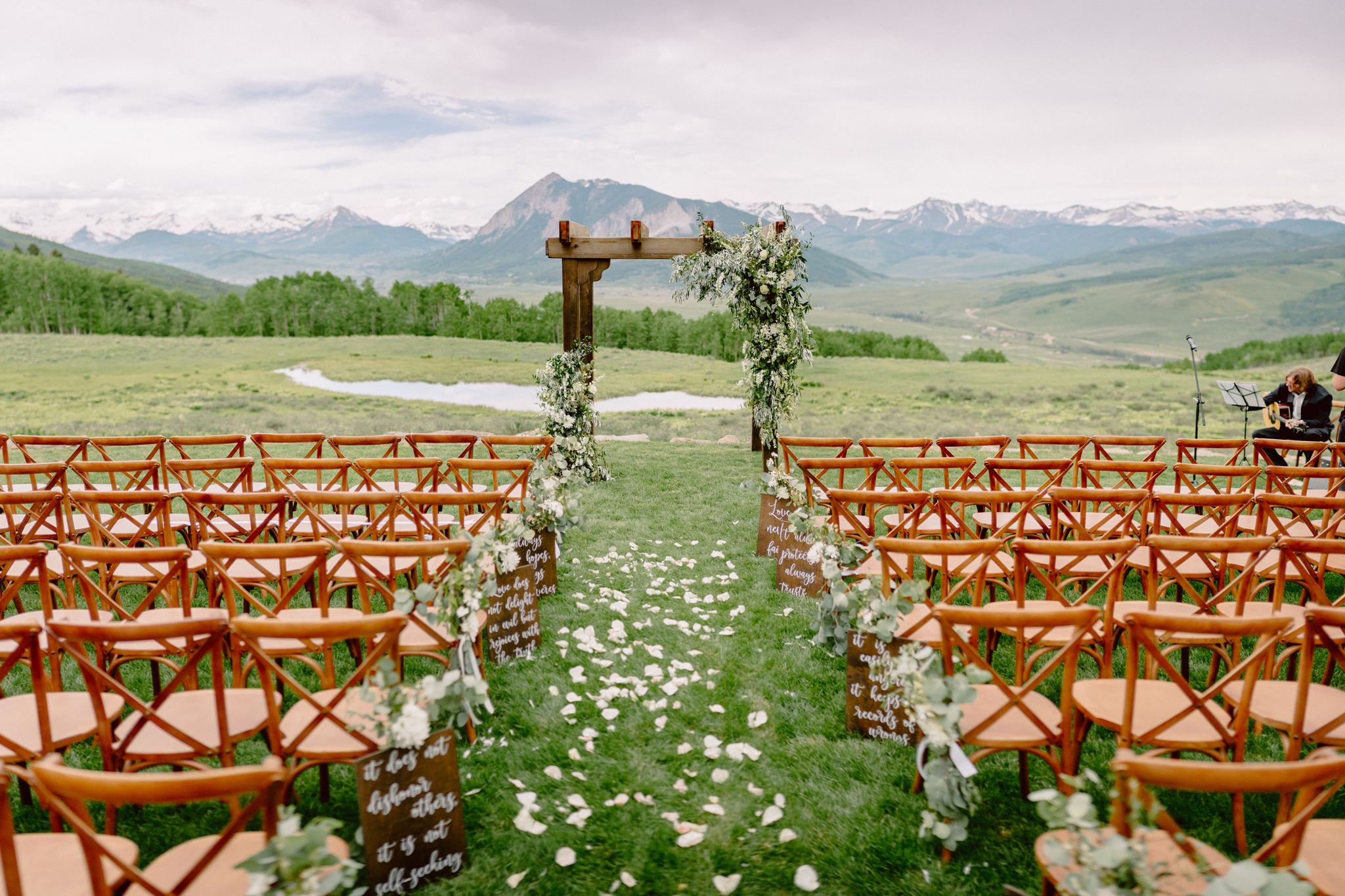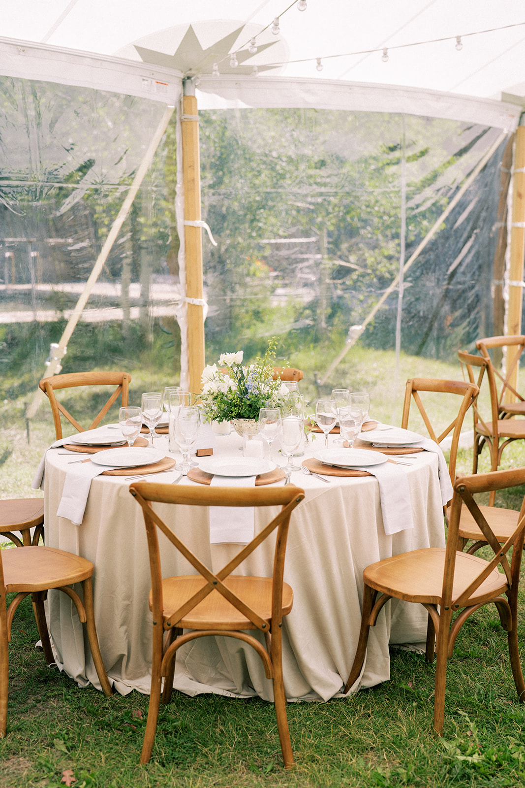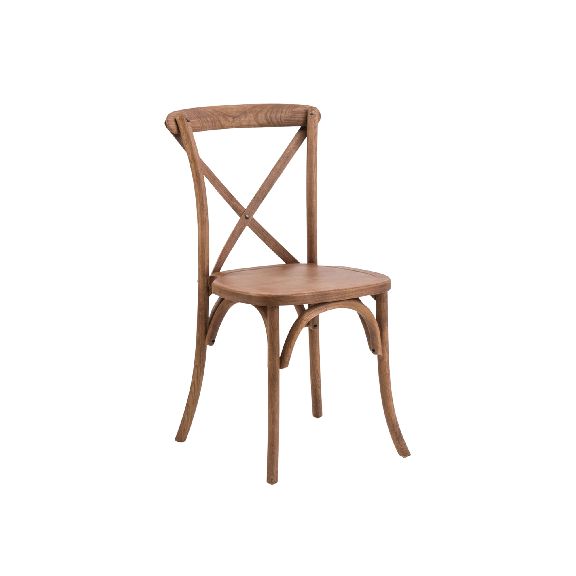 Description: This medium stained cross back chair looks amazing with out wood farm tables or a table covered in a linen. You may rent this chair with or without our linen chair pad. Chairs will be delivered with a black chair protective cover without a chair pad attached. They will also be delivered in a stack. These chairs are not waterproof and must be protected from weather. Lucky Penny will unstack, and place for an additional $1.50 each chair. If you would also like chair pads tied one, unstacked and placed, this will be an additional $2 per chair. Weight capacity is 300lbs, dynamic weight. Measurments = 17" deep, 16" wide, 18" seat height x 35" chair back height